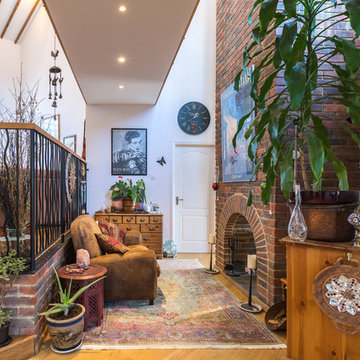 Design ideas for a bohemian living room in Essex with white walls, medium hardwood flooring, a standard fireplace, a brick fireplace surround and brown floors.
